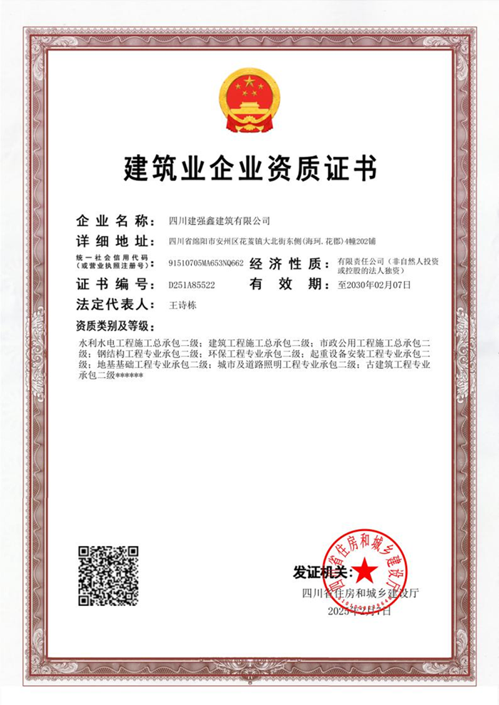 四川建強(qiáng)鑫建筑有限公司完成貳級(jí)資質(zhì)延續(xù)